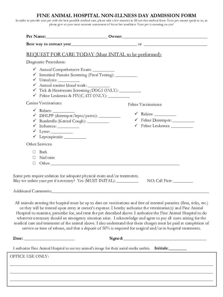 FINE ANIMAL HOSPITAL ILLNESS DAY ADMISSION FORM In order to provide your pet with the best possible medical care, please take a few minutes to fill out this medical form. Your pet cannot speak to
