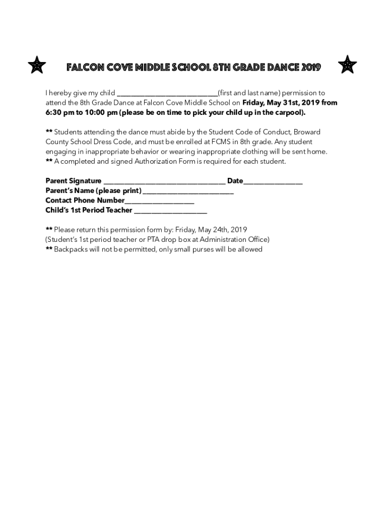 Falcon Cove Middle School 8th Grade dance 2019 I hereby give my child (first and last name) permission to attend the 8th Grade Dance at Falcon Cove Middle School on Friday, May 31st, 2019 from 6:30