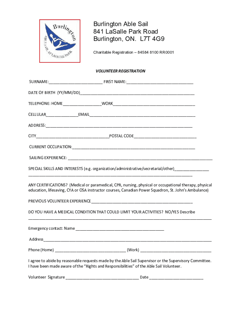 Burlington Able Sail 841 Basally Park Road Burlington, ON. L7T 4G9 Charitable Registration 84584 8100 RR0001VOLUNTEER REGISTRATION SURNAME: FIRST NAME: DATE OF BIRTH (BY/MM/DD) TELEPHONE: Homework