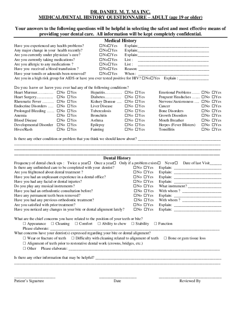 DR. DANIEL M. T. MA INC. MEDICAL/DENTAL HISTORY QUESTIONNAIRE ADULT (age 19 or older) Your answers to the following questions will be helpful in selecting the safest and most effective means of providing