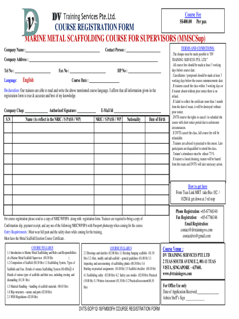 DV Training Services PTE. Ltd. Course Fee S$400.00Per course REGISTRATION FORM MARINE METAL SCAFFOLDING COURSE FOR SUPERVISORS (Miscue) Company Name : TERMS AND CONDITIONS:. The check must be made