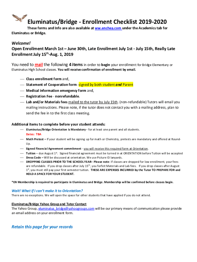 Eliminates/Bridge Enrollment Checklist 20192020 These forms and Info are also available at WW.enchea.com under the Academics tab for Eliminates or Bridge. Welcome! Open Enrollment March 1st June 30th,