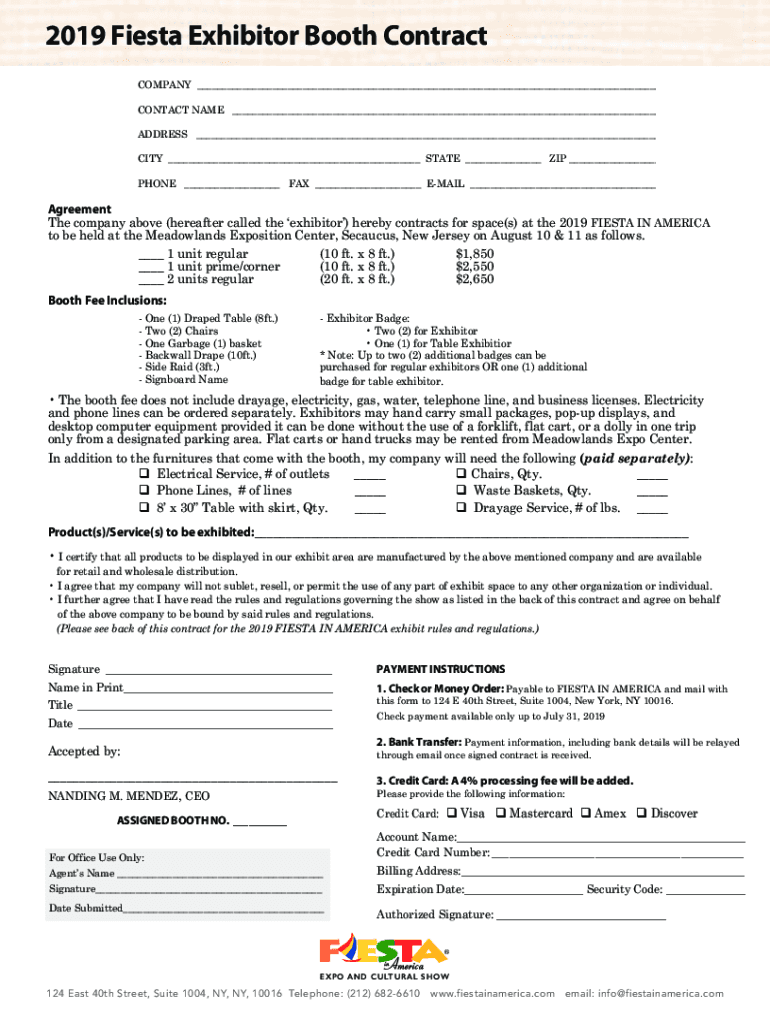 2019 Fiesta Exhibitor Booth Contract COMPANY CONTACT NAME ADDRESS CITY STATE ZIP PHONE FAX EMAIL Agreement The company above (hereafter called the exhibitor) hereby contracts for space(s) at the 2019
