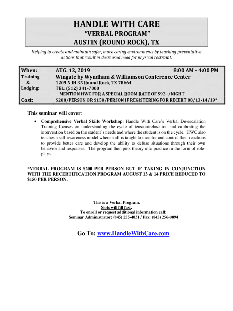 HANDLE WITH CARE VERBAL PROGRAM AUSTIN (ROUND ROCK), TX Helping to create and maintain safer, more caring environments by teaching preventative actions that result in decreased need for physical restraint.