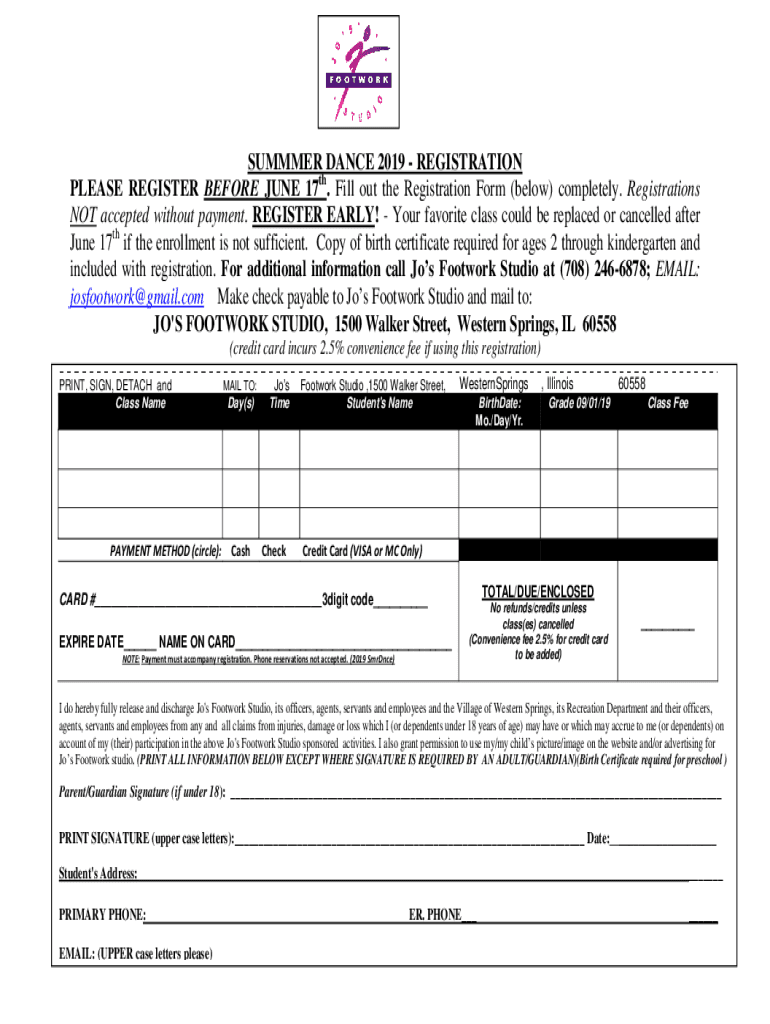 SUMMER DANCE 2019 REGISTRATION PLEASE REGISTER BEFORE JUNE 17th. Fill out the Registration Form (below) completely. Registrations NOT accepted without payment. REGISTER EARLY! Your favorite class