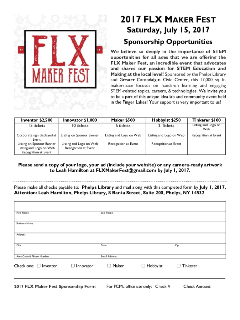 2017 FLY MAKER FEST Saturday, July 15, 2017, Sponsorship Opportunities We believe so deeply in the importance of STEM opportunities for all ages that we are offering the FLY Maker Fest, an incredible
