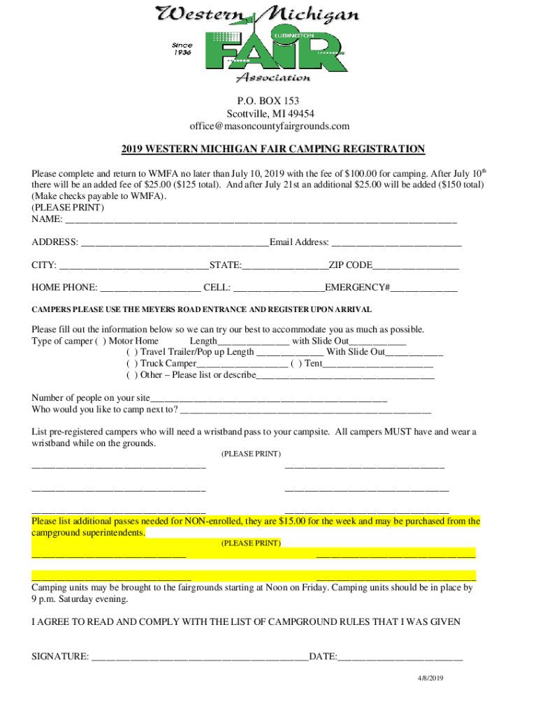 P.O. BOX 153 Scottsdale, MI 49454 office masoncountyfairgrounds.com 2019 WESTERN MICHIGAN FAIR CAMPING REGISTRATION Please complete and return to MFA no later than July 10, 2019, with the fee of $100.00