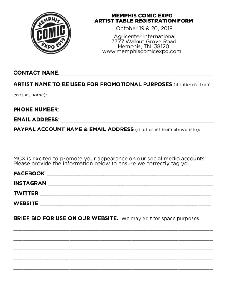 MEMPHIS COMIC EXPO ARTIST TABLE REGISTRATION FORM October 19 & 20, 2019 Epicenter International 7777 Walnut Grove Road Memphis, TN 38120 www.memphiscomicexpo.comCONTACT NAME: ARTIST NAME TO BE USED