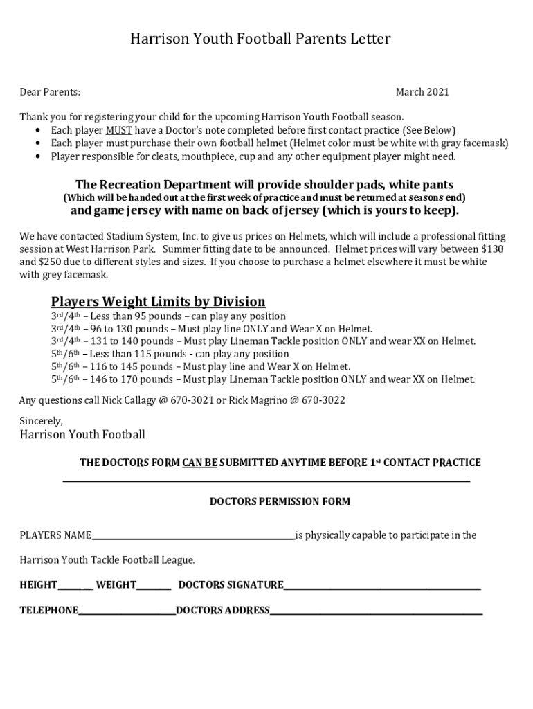 Harrison Youth Football Parents Letter Dear Parents:March 2021Thank you for registering your child for the upcoming Harrison Youth Football season. Each player MUST have a doctor note completed before