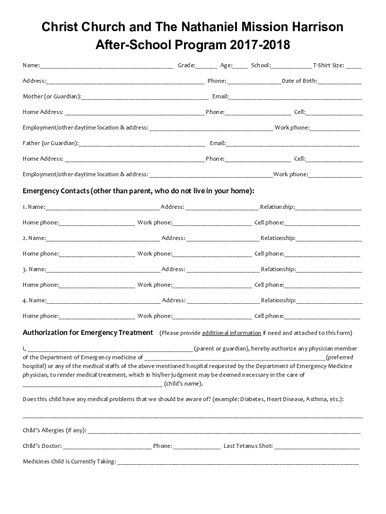 Christ Church and The Nathaniel Mission Harrison Interschool Program 20172018 Name: Grade: Age: School: Shirt Size: Address: Phone: Date of Birth: Mother (or Guardian): Email: Home Address: Phone: