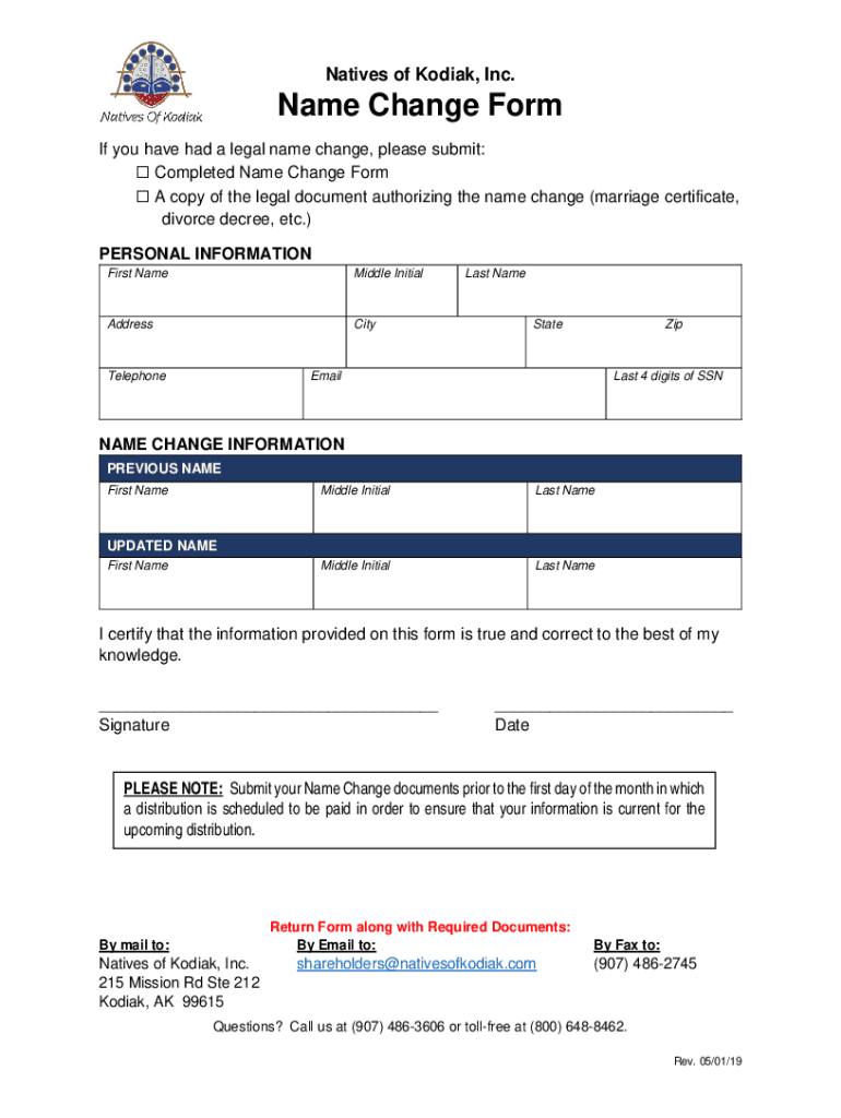 Natives of Kodiak, Inc. Name Change Form If you have had a legal name change, please submit: Completed Name Change Form A copy of the legal document authorizing the name change (marriage certificate,