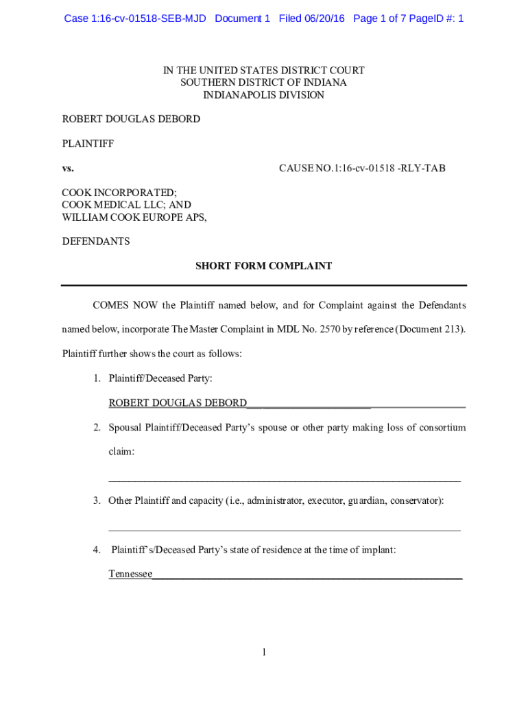 Case 1:16cv01518SEBMJD Document 1 Filed 06/20/16-Page 1 of 7 Paged #: 1IN THE UNITED STATES DISTRICT COURT