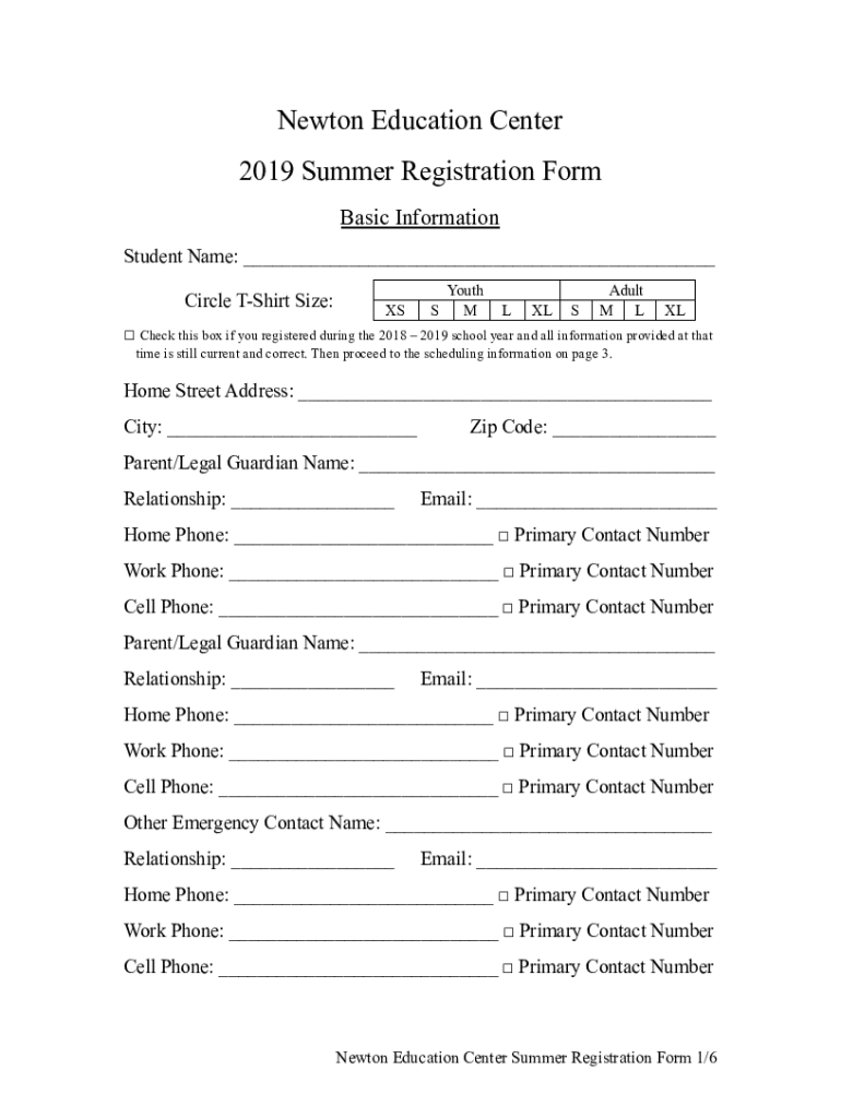 4/13/2019Summer Registration Form 2019 Google Docs Newton Education Center 2019 Summer Registration Form Basic Information Student Name: Circle Shirt Size:South MLXLSAdult M LCL Check this box if