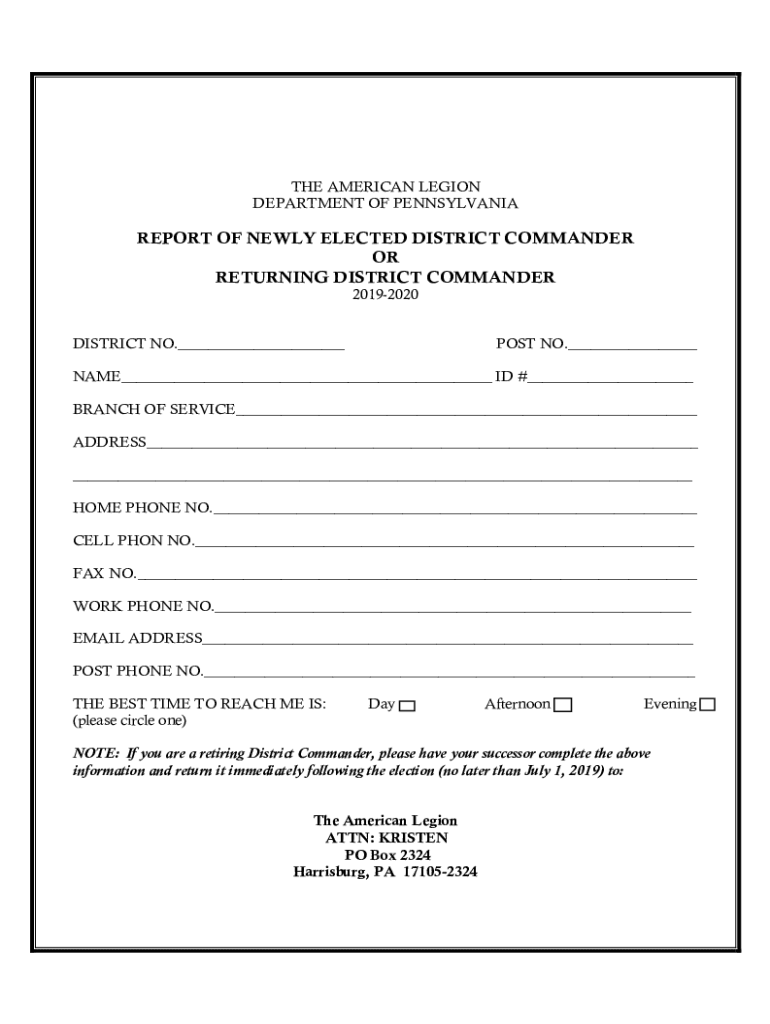 THE AMERICAN LEGION DEPARTMENT OF PENNSYLVANIAREPORT OF NEWLY ELECTED DISTRICT COMMANDER OR RETURNING DISTRICT COMMANDER 20192020DISTRICT NO. POST NO. NAME ID # BRANCH OF SERVICE ADDRESS HOME PHONE