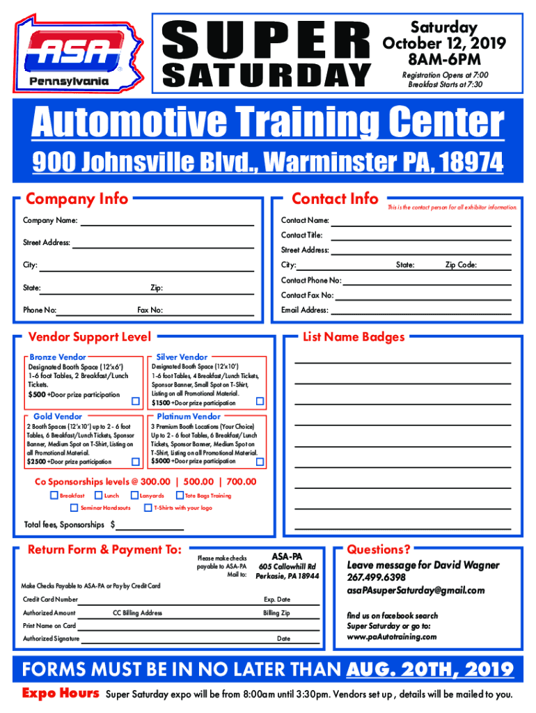 SUPER S AT U R D Saturday, October 12, 2019 8AM6PM Registration Opens at 7:00 Breakfast Starts at 7:30Automotive Training Center 900 Joinville Blvd., War minster PA, 18974Company Noncontact Intercompany