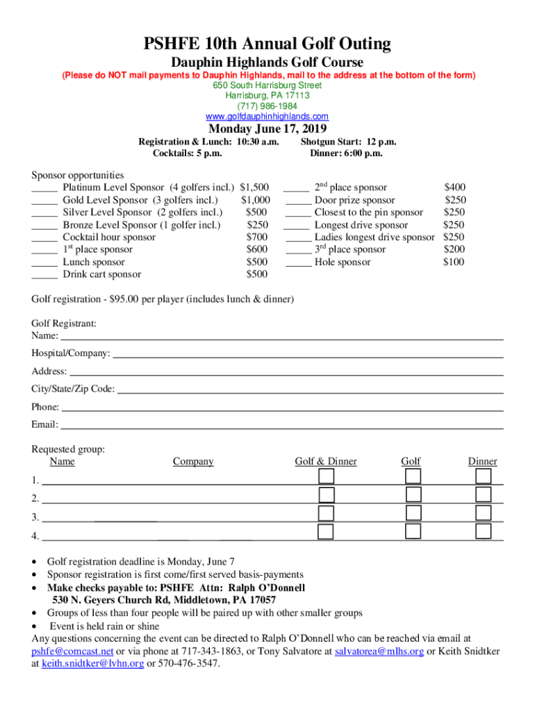 SHE 10th Annual Golf Outing Dauphin Highlands Golf Course (Please do NOT mail payments to Dauphin Highlands, mail to the address at the bottom of the form) 650 South Harrisburg Street Harrisburg,