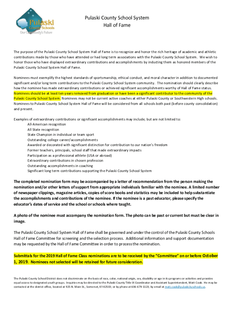 Get the free Nominations sought for 4th class of Pulaski County Schools ...