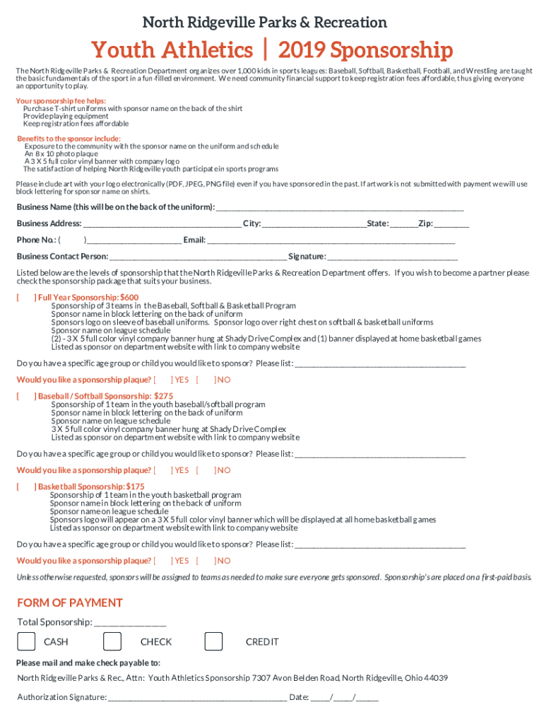 North Ridgeville Parks & RecreationYouth Athletics 2019 Sponsorship The North Ridgeville Parks & Recreation Department organizes over 1,000 kidskin sports leagues: Baseball, Softball, Basketball,