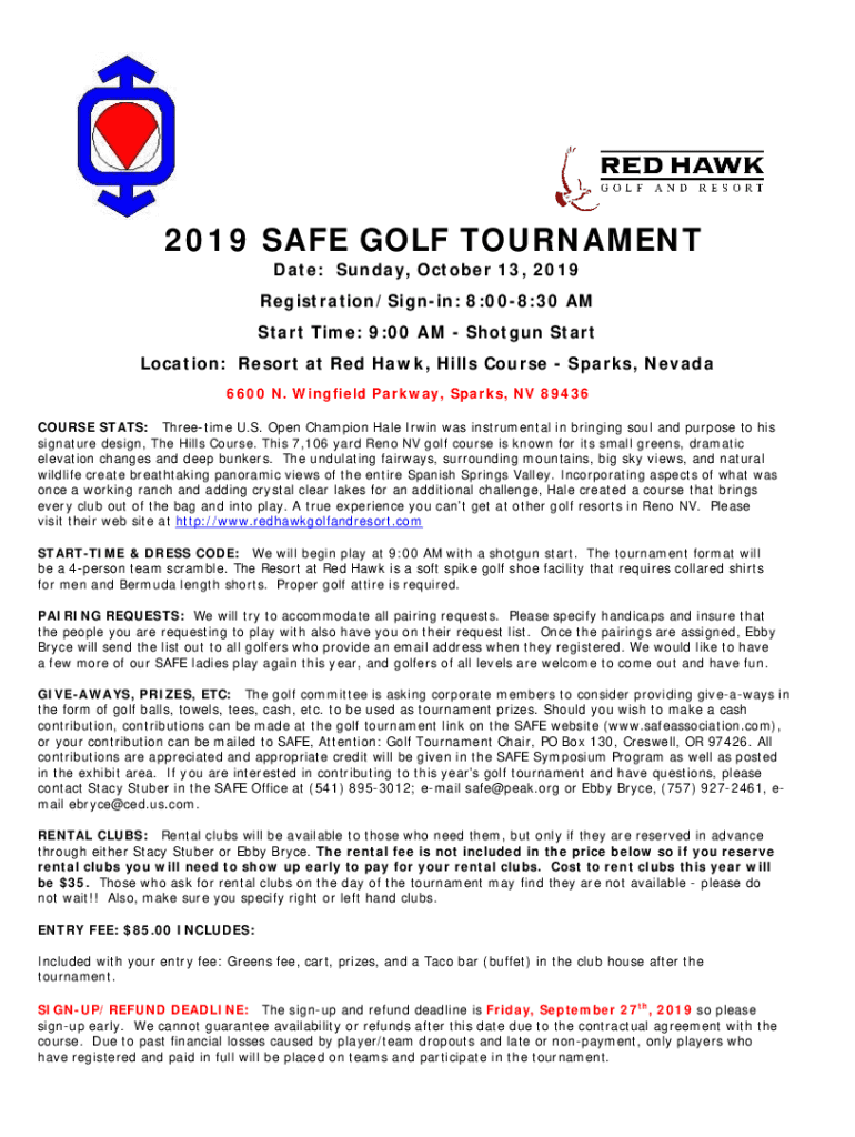 2019 SAFE GOLF TOURNAMENT Date: Sunday, October 13, 2019Registration/Signing: 8:008:30 AM Start Time: 9:00 AM Shotgun Start Location: Resort at Red Hawk, Hills Course Sparks, Nevada 6600 N. Wingfield