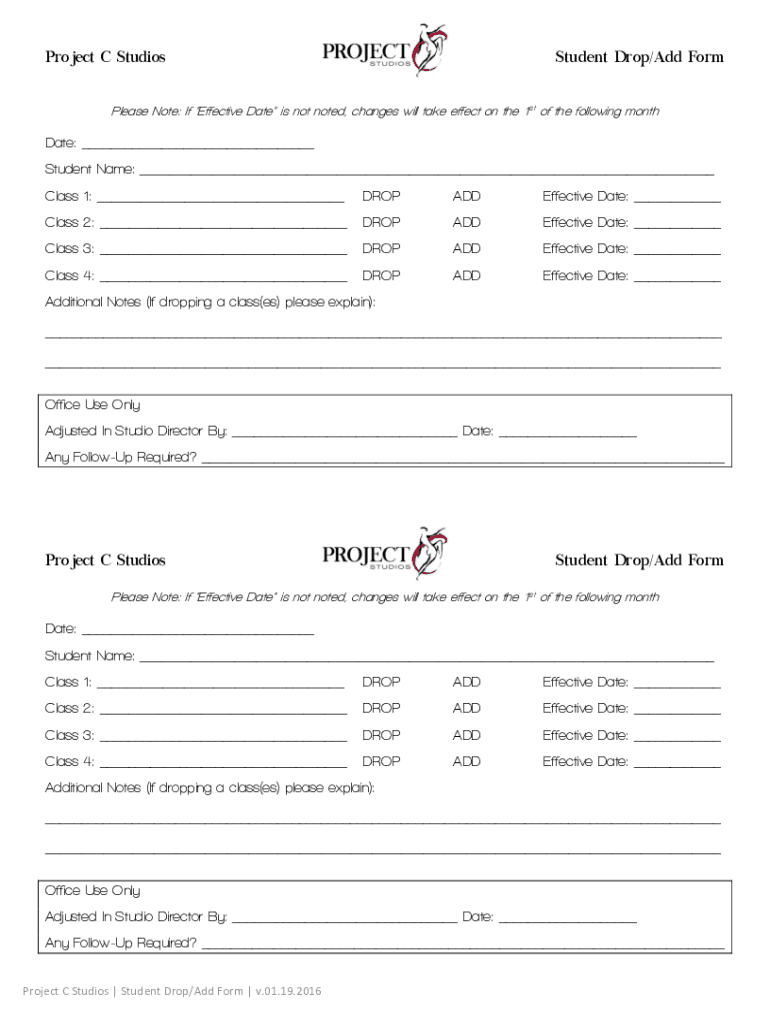 Project C StudiosStudent Drop/Add Formulas Note: If Effective Date is not noted, changes will take effect on the 1st of the following mandate: Student Name: Class 1: DROPADDEffective Date: Class 2: