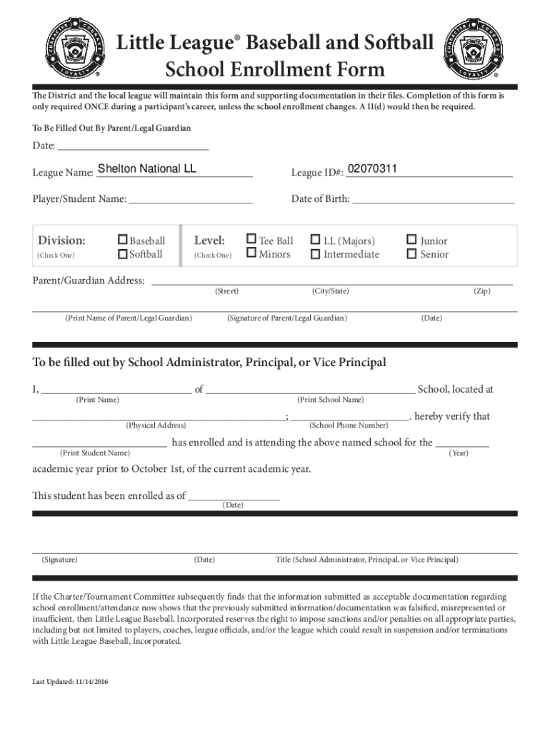 Little League Baseball and Softball School Enrollment Form The District and the local league will maintain this form and supporting documentation in their files. Completion of this form is only required