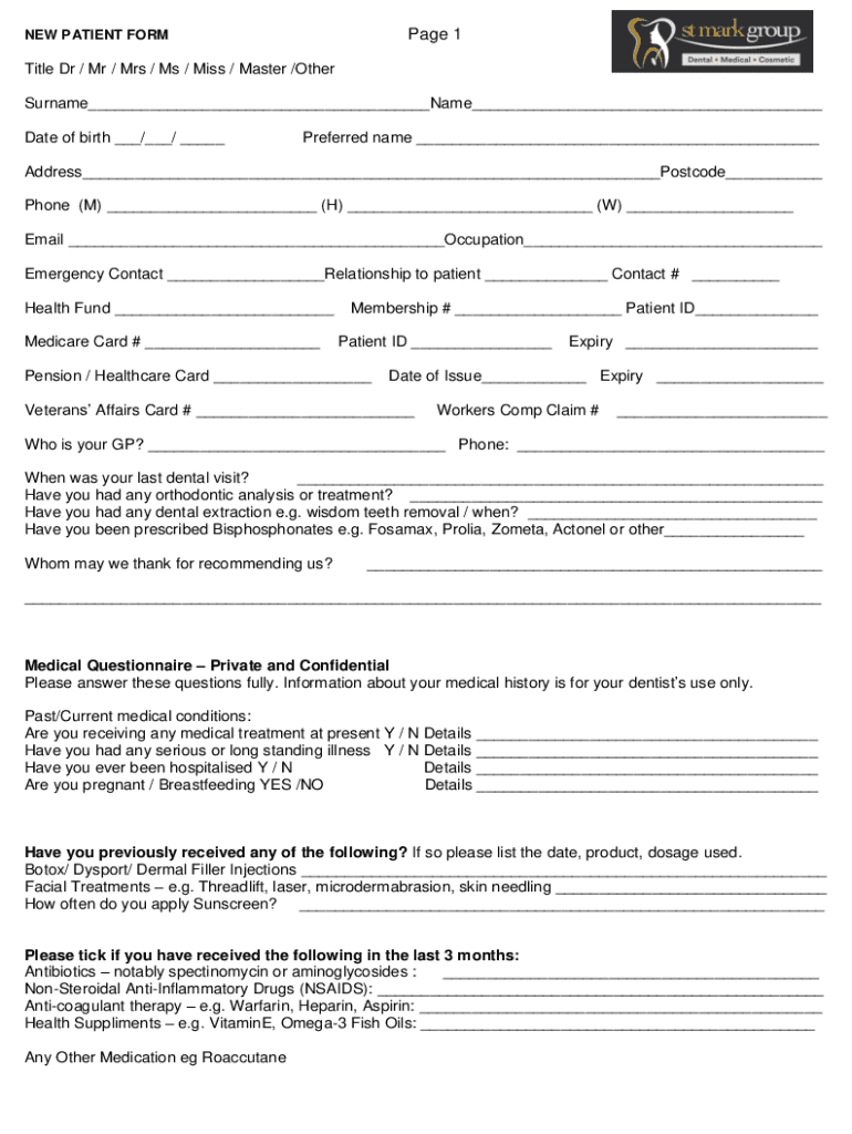 Page 1NEW PATIENT Fertile Dr / Mr / Mrs / Ms / Miss / Master /Other Surname Name Date of birth / / Preferred name Address Postcode Phone (M) (H) (W) Email Occupation Emergency Contact Relationship