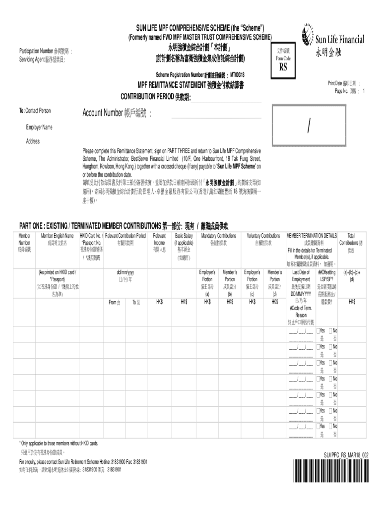 SUN LIFE MPH COMPREHENSIVE SCHEME (the Scheme) (Formerly named FWD MPH MASTER TRUST COMPREHENSIVE SCHEME) ()Participation Number : Servicing Agent : Form CodeRSScheme Registration Number : MT00318Print