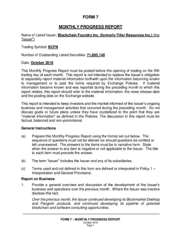 Name of Listed Issuer: Blockchain Foundry Inc. (formerly Tiller Resources Inc.) (the