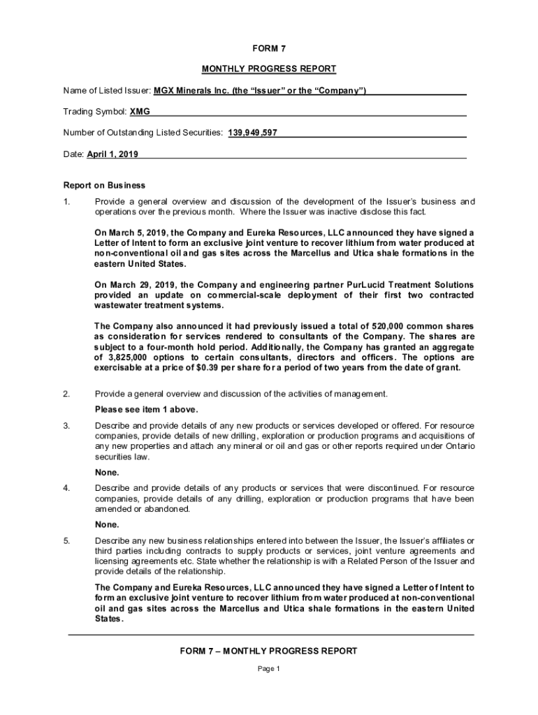 Get the free Name of Listed Issuer: MGX Minerals Inc
