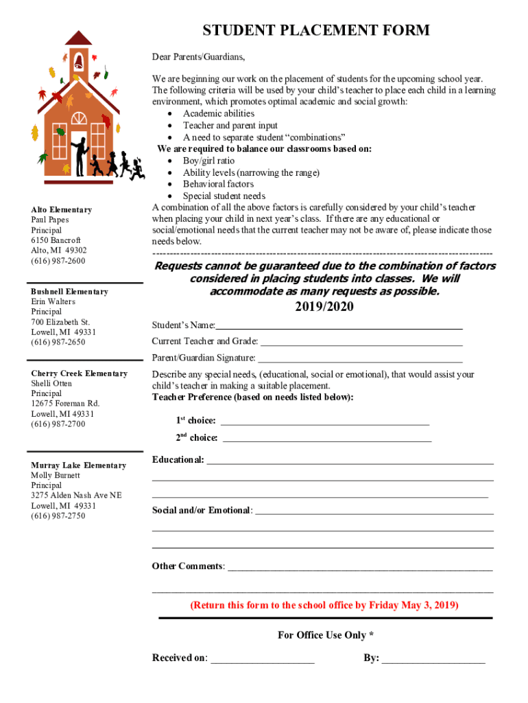 STUDENT PLACEMENT FORM Dear Parents/Guardians, Alto Elementary Paul Paper Principal 6150 Bancroft Alto, MI 49302 (616) 9872600 Bushnell Elementary Erin Walters Principal 700 Elizabeth St. Lowell,