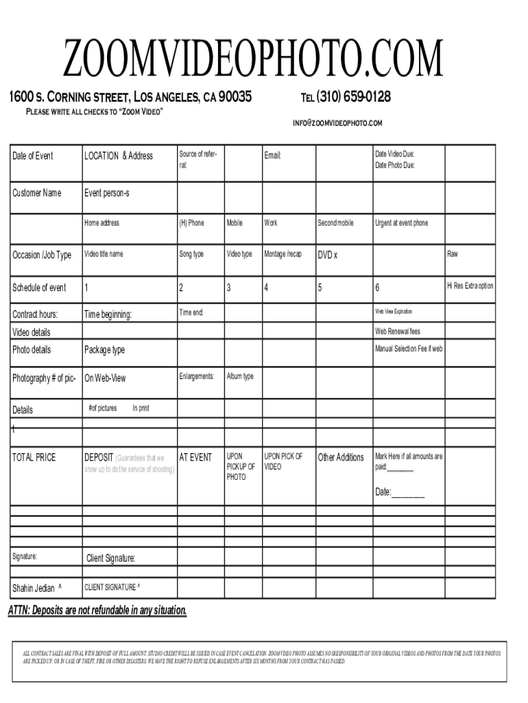 ZOOMVIDEOPHOTO.COM 1600 s. Corning street, Los Angeles, ca 90035Tel (310)6590128Please write all checks to Zoom Video info zoomvideophoto. Combat of EventLOCATION & AddressCustomer Nonevent personsEmail:Source