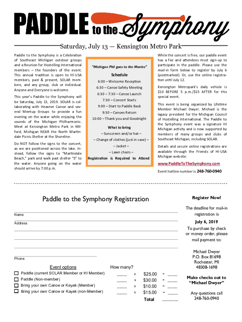 Saturday, July 13 Kensington Metro Park Paddle to the Symphony is a Celebration of Southeast Michigan outdoor groups and a Reunion for Hosteling International members the founders of the event. This