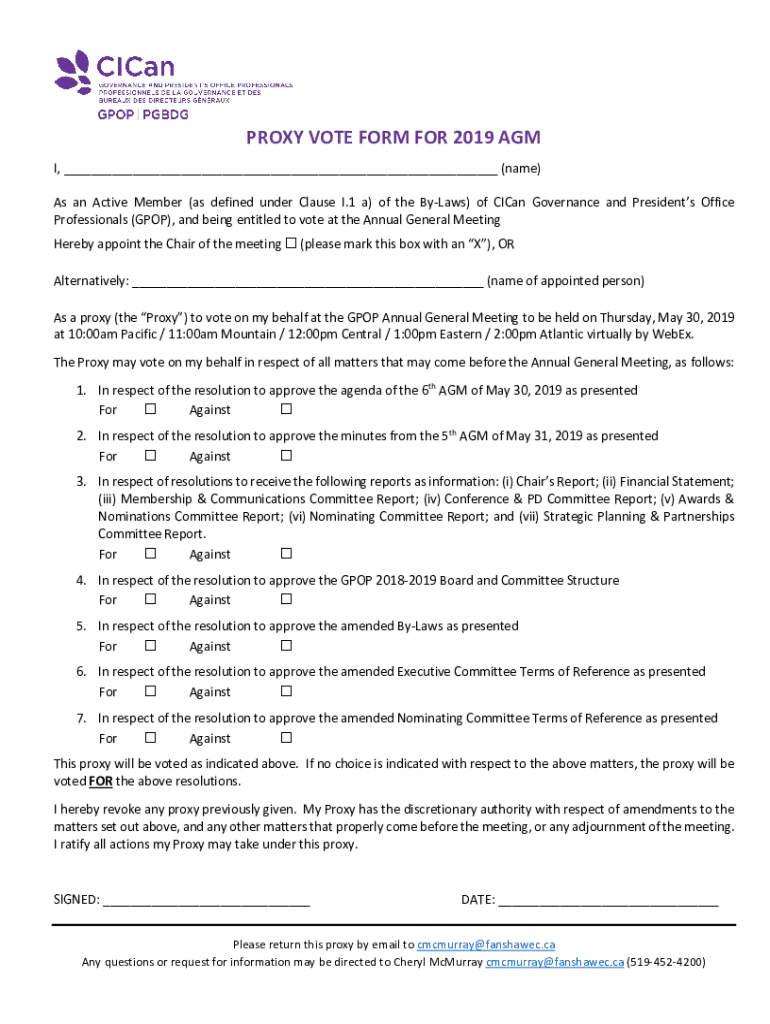 PROXY VOTE FORM FOR 2019 AGM I, (name) As an Active Member (as defined under Clause I.1 a) of the Bylaws) of CICAM Governance and Presidents Office Professionals (POP), and being entitled to vote