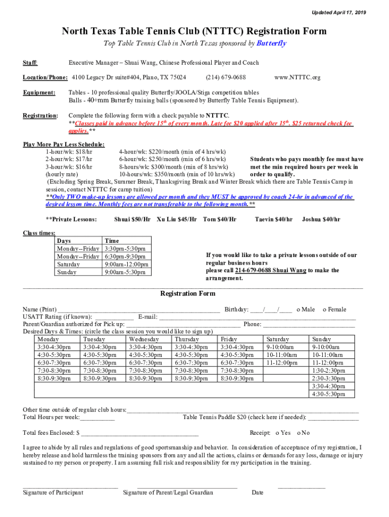 Updated April 17, 2019North Texas Table Tennis Club (NT TTC) Registration Form Top Table Tennis Club in North Texas sponsored by Butterfly Staff:Executive Manager Squad Wang, Chinese Professional