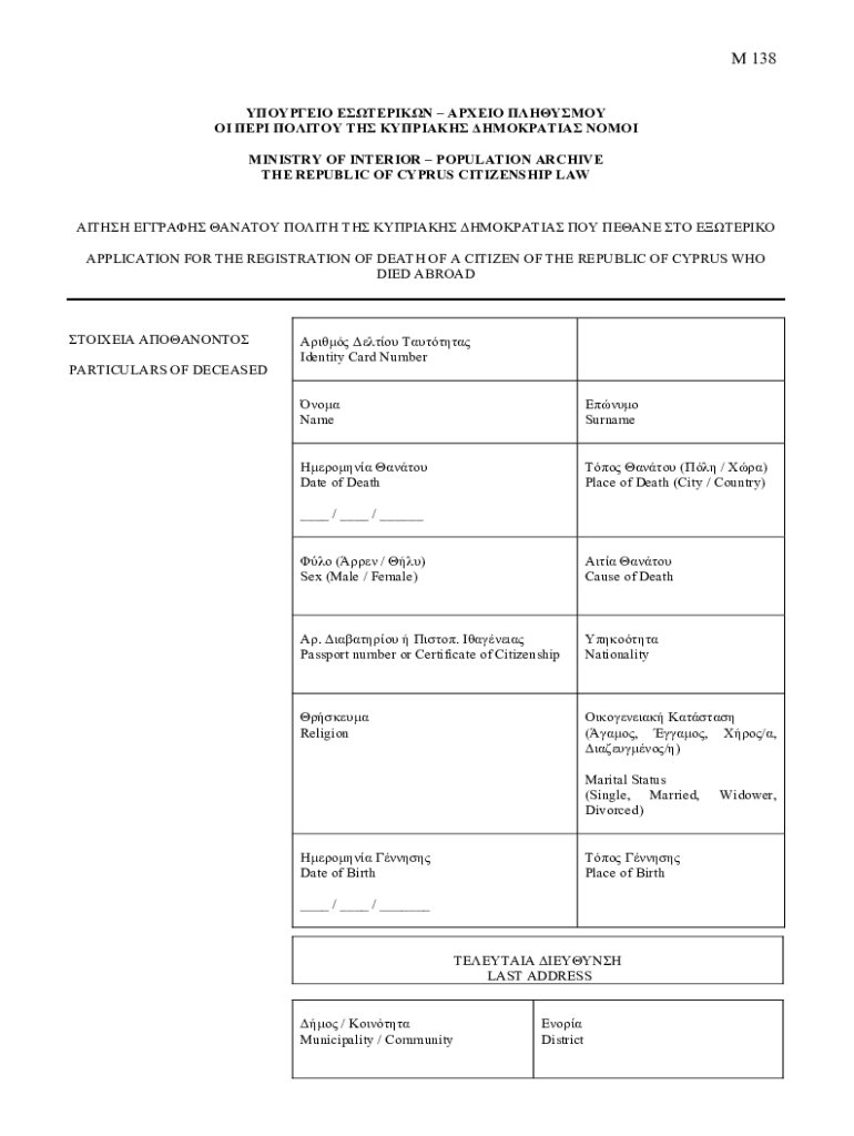 M 138 MINISTRY OF INTERIOR POPULATION ARCHIVE THE REPUBLIC OF CYPRUS CITIZENSHIP LAW APPLICATION FOR THE REGISTRATION OF DEATH OF A CITIZEN OF THE REPUBLIC OF CYPRUS WHO DIED
