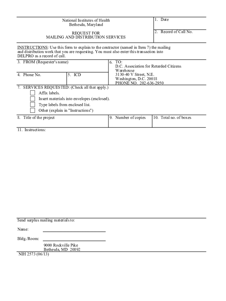 Get the free FORM NIH 2573. Request for Mailing and Distribution Services - oma od nih