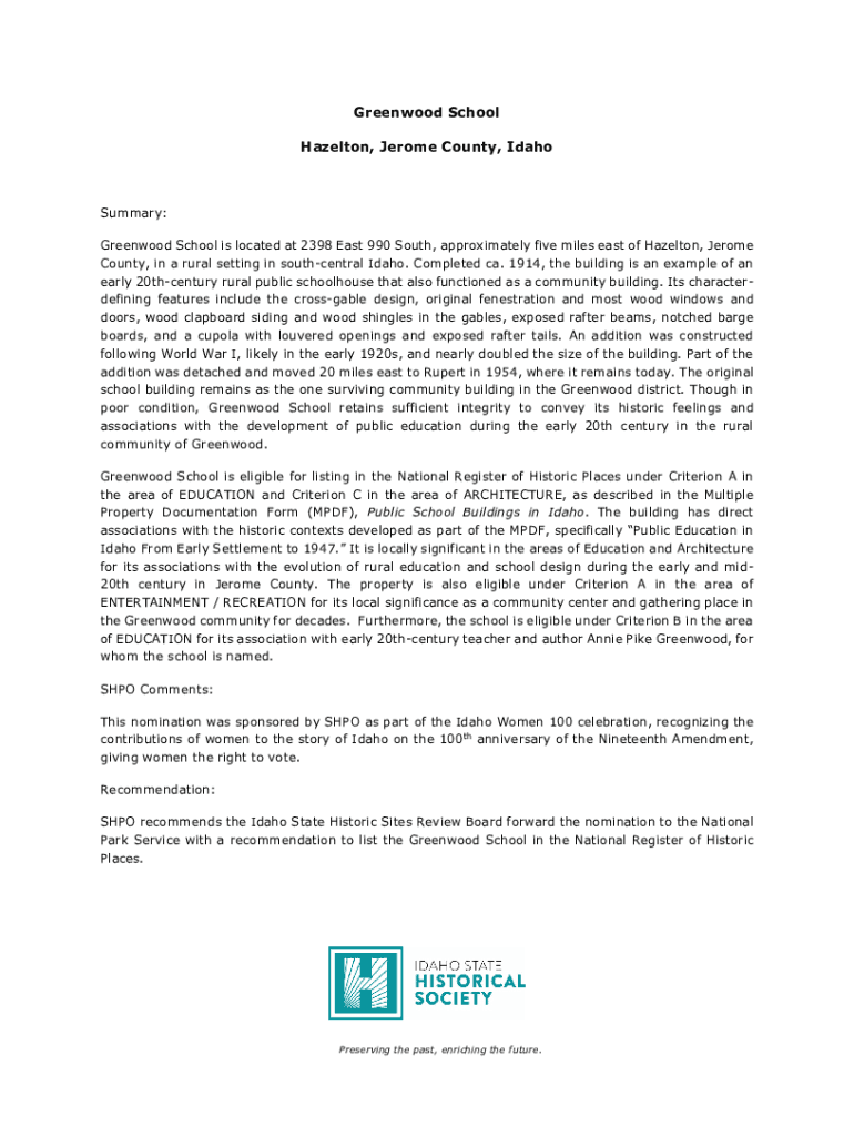Get the free Greenwood School, Jerome County - Idaho State Historical ... - history idaho