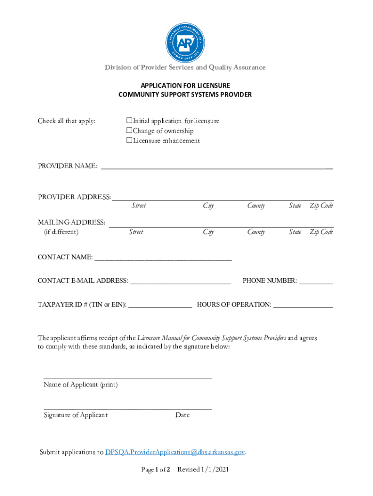 Division of Provider Services and Quality Assurance APPLICATION FOR LICENSURE COMMUNITY SUPPORT SYSTEMS PROVIDER Check all that apply:Initial application for licensure Change of ownership Licensure
