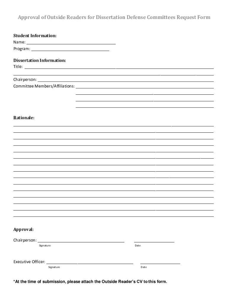 Approval of Outside Readers for Dissertation Defense Committees Request Form Student Information: Name: Program: Dissertation Information: Title: Chairperson: Committee Members/Affiliations: Rationale: