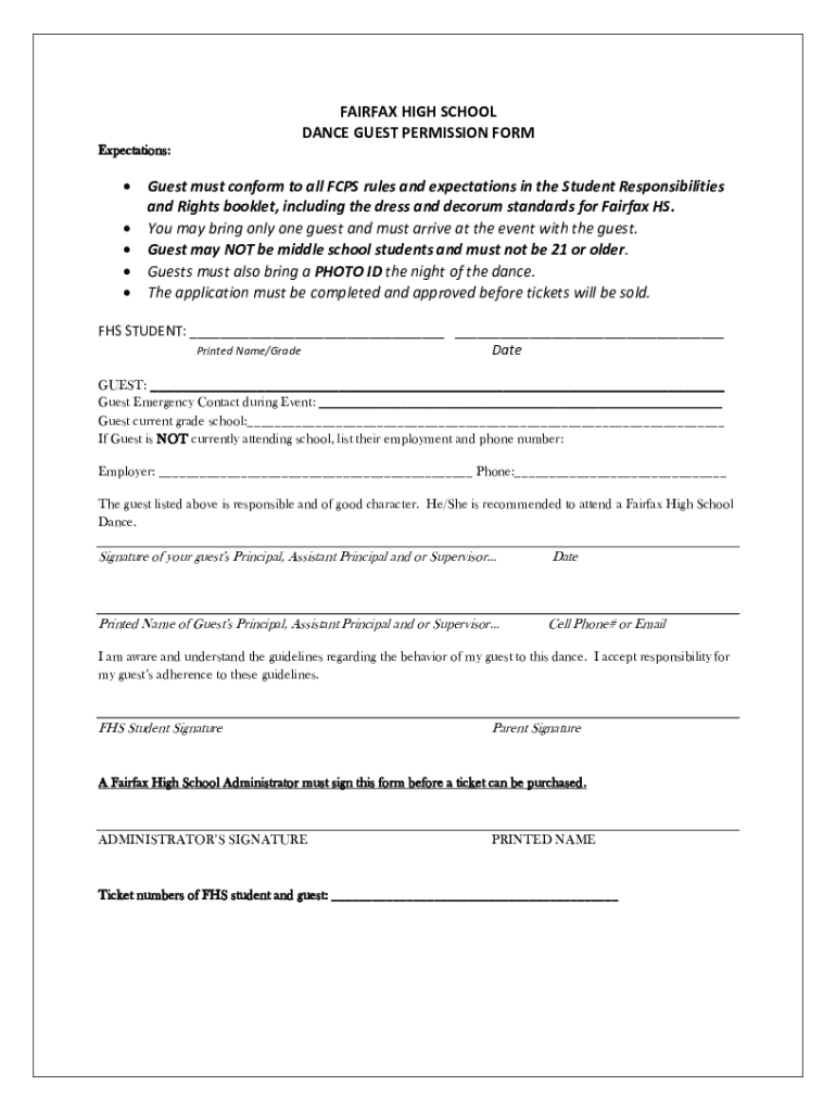 Expectations: FAIRFAX HIGH SCHOOL DANCE GUEST PERMISSION Forest must conform to all FCS rules and expectations in the Student Responsibilities and Rights booklet, including the dress and decorum standards