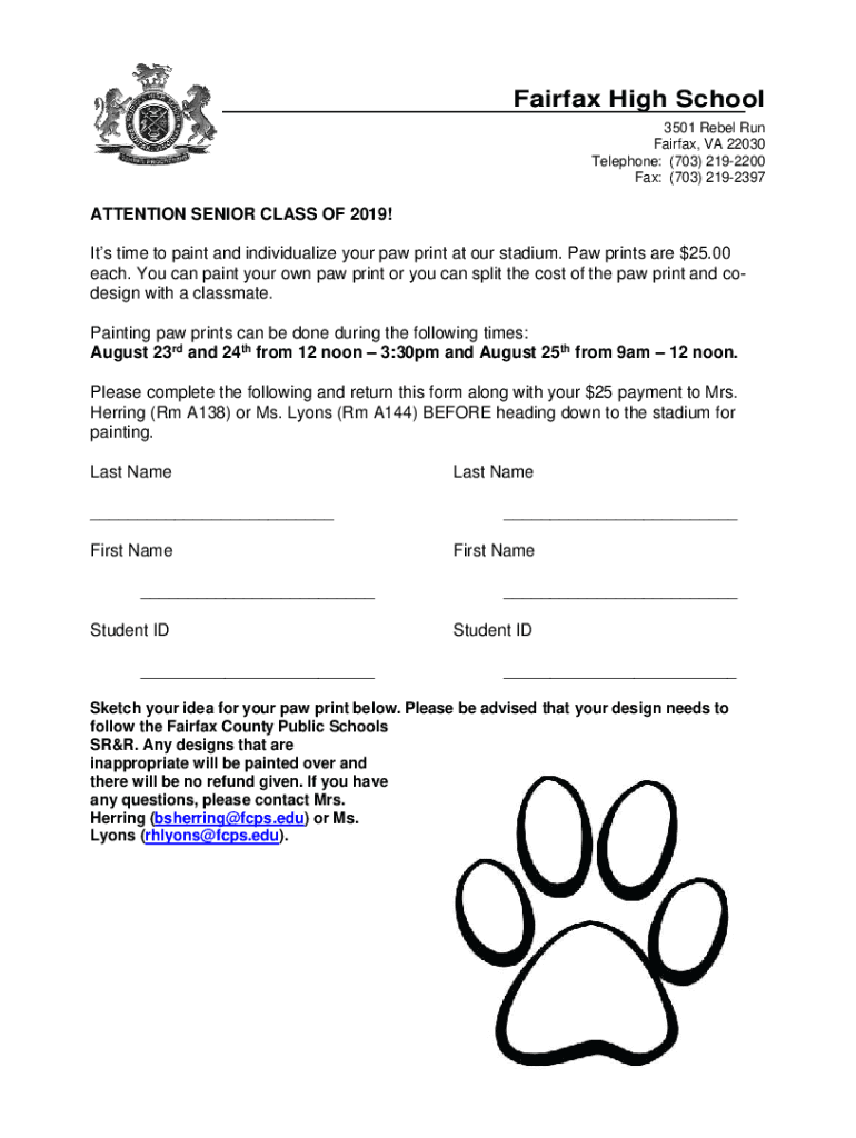 Fairfax High School 3501 Rebel Run Fairfax, VA 22030 Telephone: (703) 2192200 Fax: (703) 2192397ATTENTION SENIOR CLASS OF 2019! It's time to paint and individualize your paw print at our stadium.