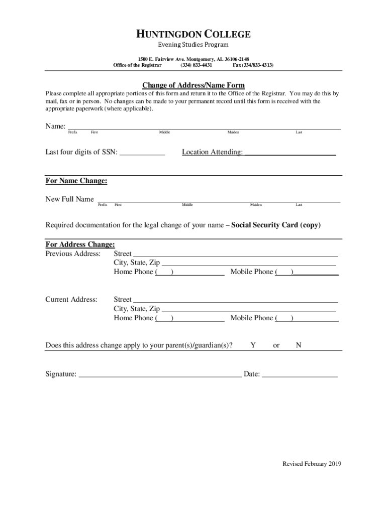 HUNTINGTON COLLEGE Evening Studies Program 1500 E. Fairview Ave. Montgomery, AL 361062148 Office of the Registrar (334) 8334431 Fax (334/8334313)Change of Address/Name Form Please complete all appropriate
