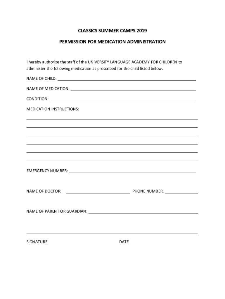CLASSICS SUMMER CAMPS 2019 PERMISSION FOR MEDICATION ADMINISTRATION hereby authorize the staff of the UNIVERSITY LANGUAGE ACADEMY FOR CHILDREN to administer the following medication as prescribed