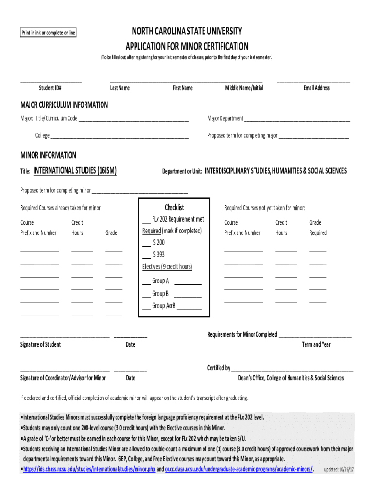 Get the free NORTH CAROLINA STATE UNIVERSITY APPLICATION FOR MINOR ...
