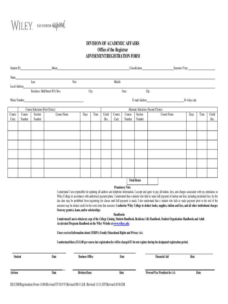 DIVISION OF ACADEMIC AFFAIRS Office of the Registrar ADVISEMENT/REGISTRATION FORM Student IDMajorClassificationSemester /Rename LastFirstMiddleLocal Address Residence Hall/Street /P.O. BoxCityStatePhone