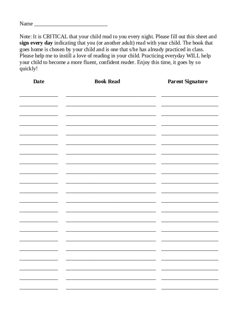 How to fill out Note: It is CRITICAL that your child read to you every night
