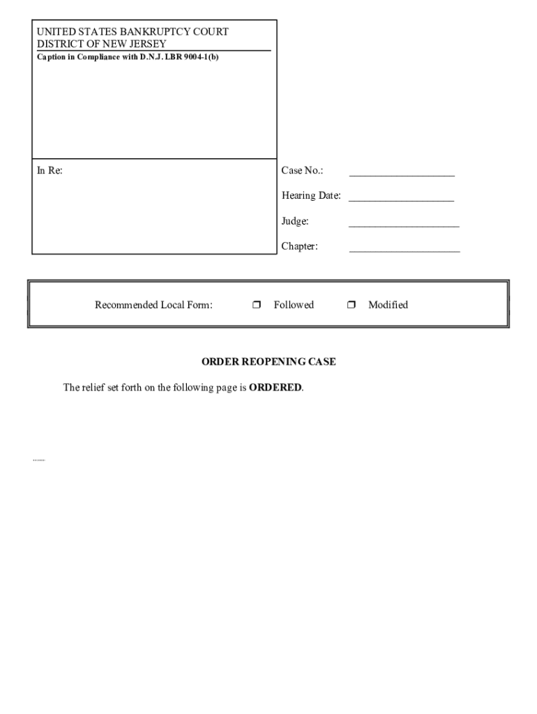 UNITED STATES BANKRUPTCY COURT DISTRICT OF NEW JERSEY Caption in Compliance with D.N.J. LB 90041(b)In Re:Case No.: Hearing Date: Recommended Local Form:Judge: Chapter: FollowedORDER REOPENING CASE