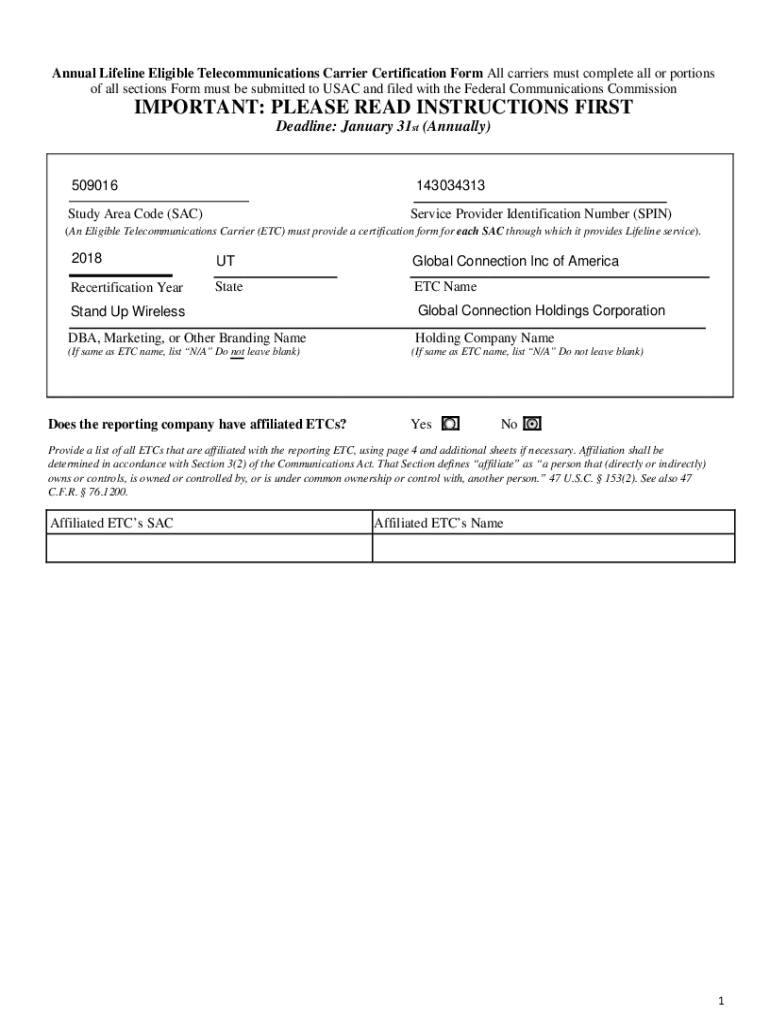 Annual Lifeline Eligible Telecommunications Carrier Certification Form All carriers must complete all or portions