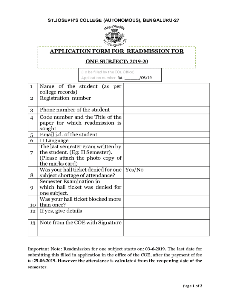 ST.JOSEPHS COLLEGE (AUTONOMOUS), BENGALURU27APPLICATION FORM FOR READMISSION FOR ONE SUBJECT: 201920 (To be filled by the COE Office) Application number RA : /OS/191 2Name of the student (as per college