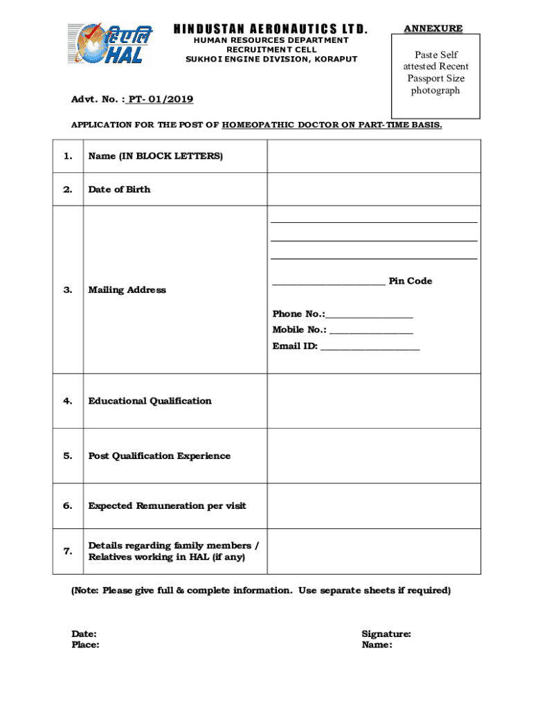 HINDUSTAN AERONAUTICS LTD. HUMAN RESOURCES DEPARTMENT RECRUITMENT CELL SUK HOI ENGINE DIVISION, KORAPUTANNEXUREPaste Self attested Recent Passport Size photographed. No. PT 01/2019 APPLICATION FOR